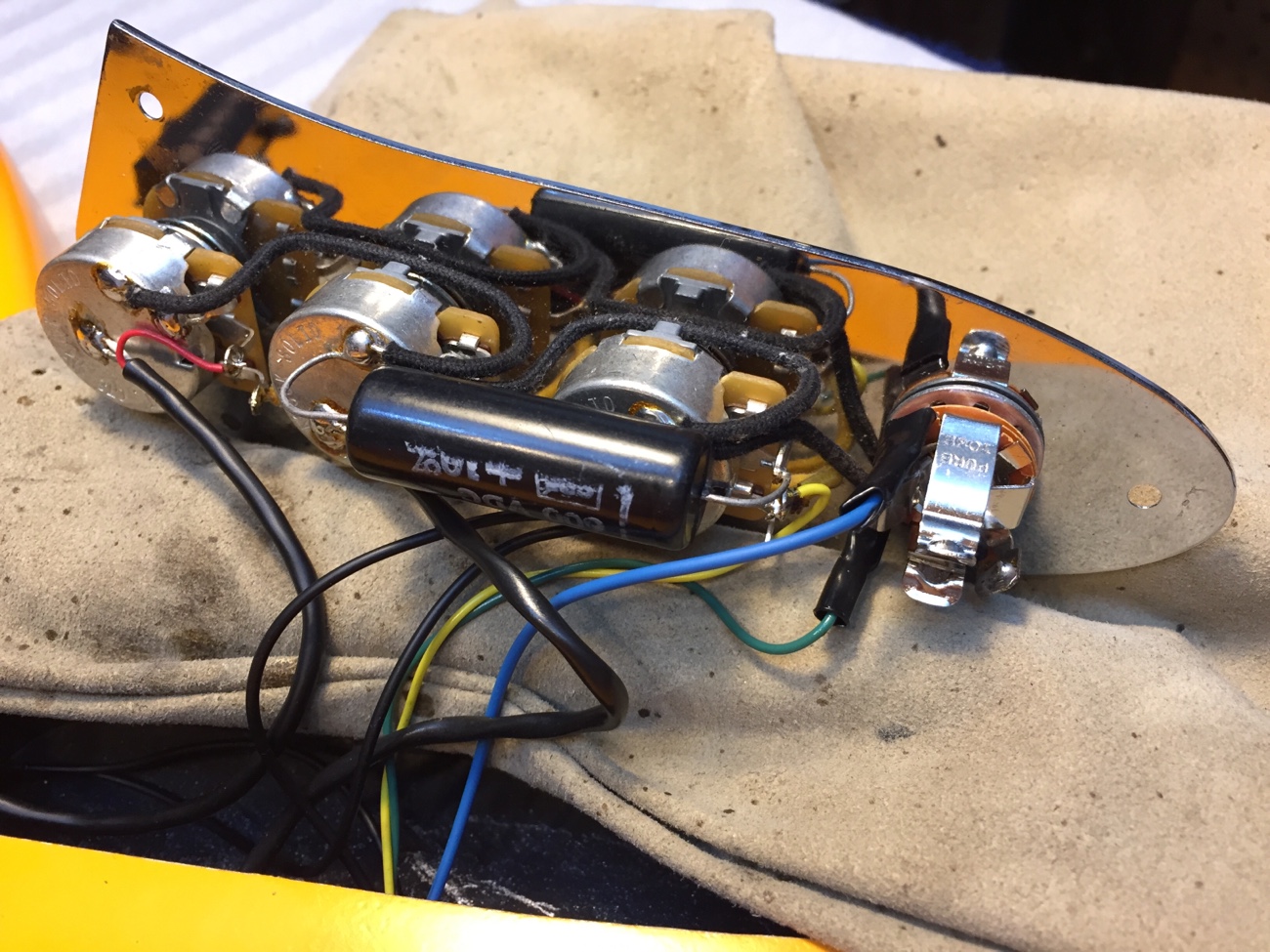 配線の確認をして通電チェックすれば、ネックを付けて弦を張って完成ですね。
