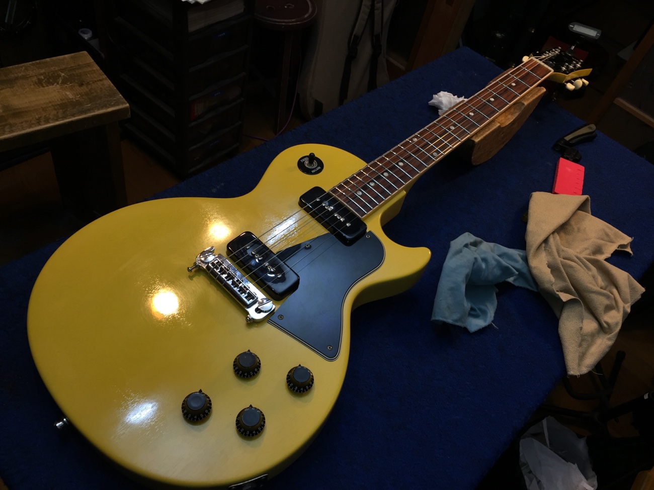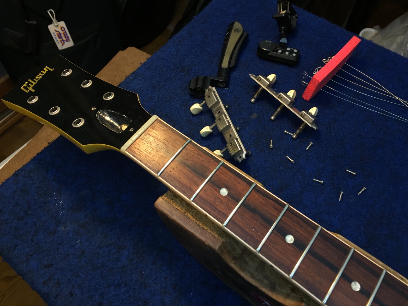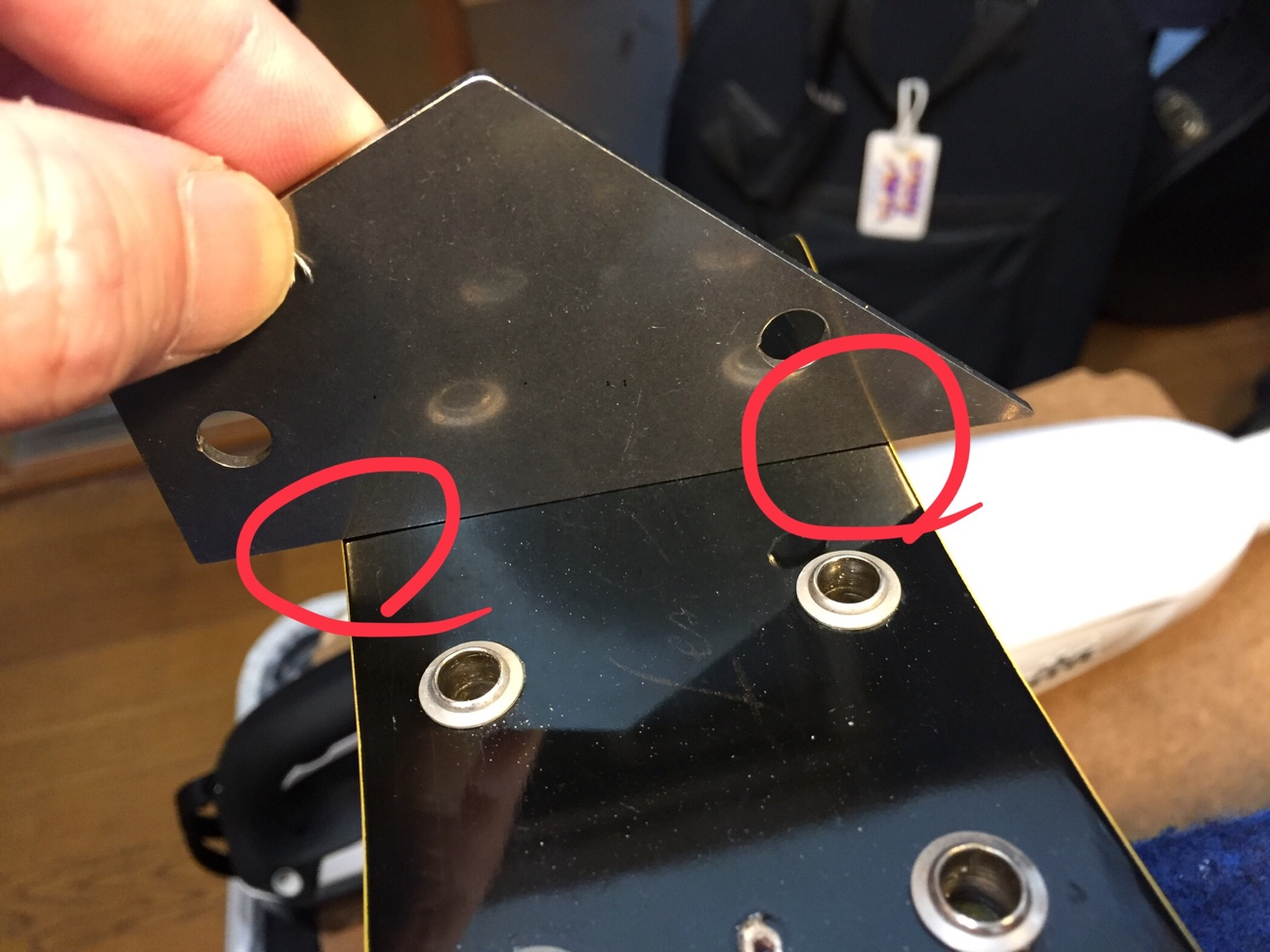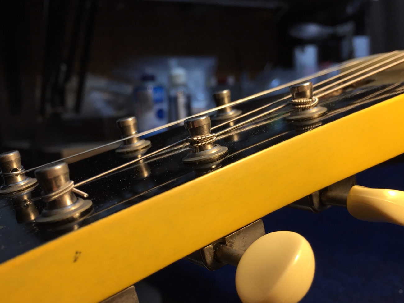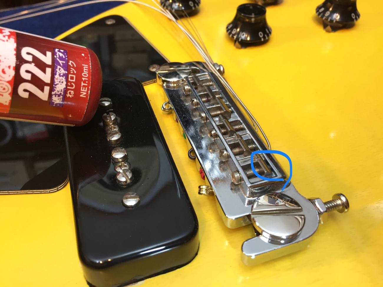 開放弦を元気いっぱい鳴らすとどこかから共鳴音がします。 ネジ先が動くところがあるので、気になるところを低粘度ネジロックで仮固定しました。