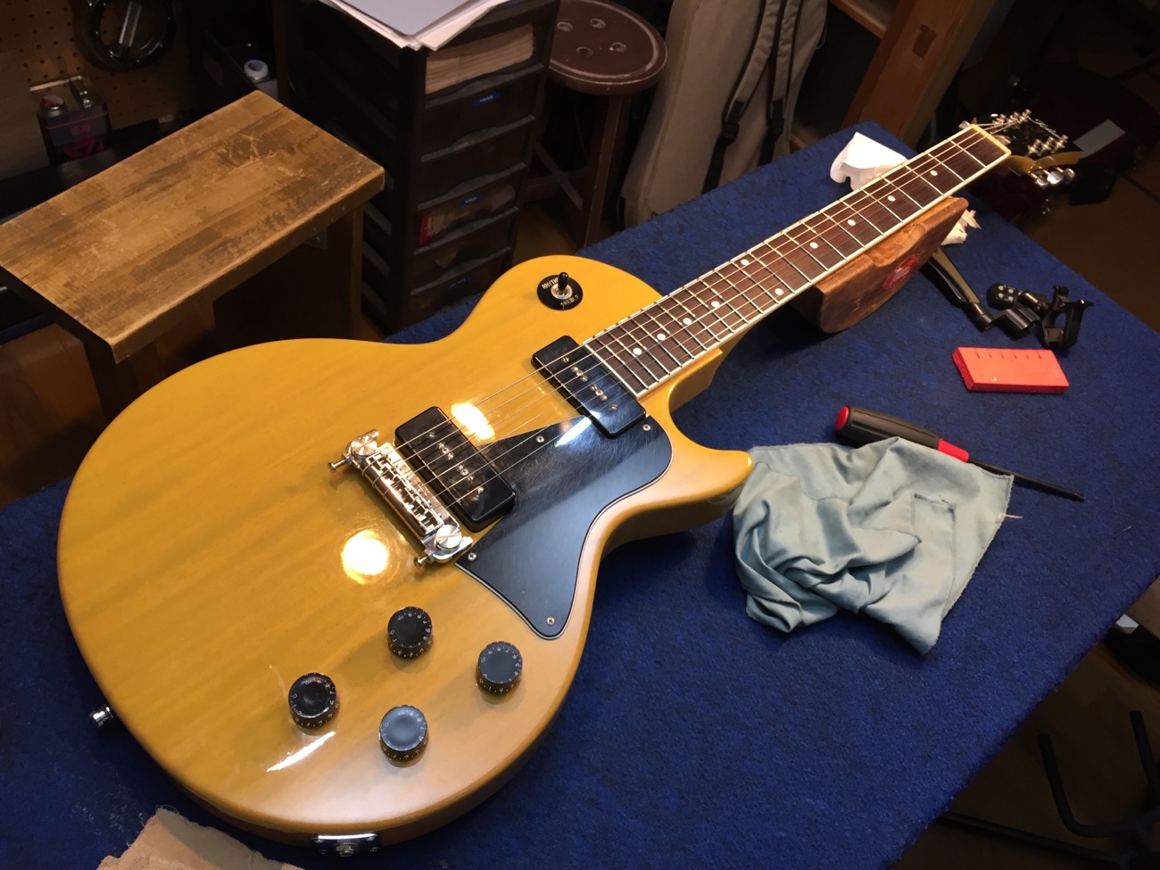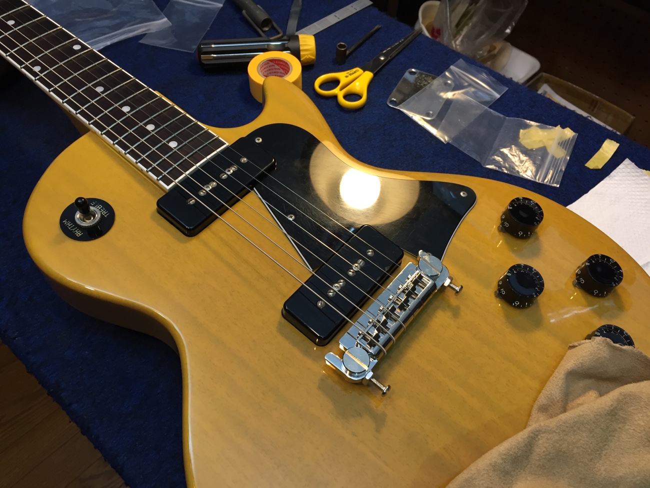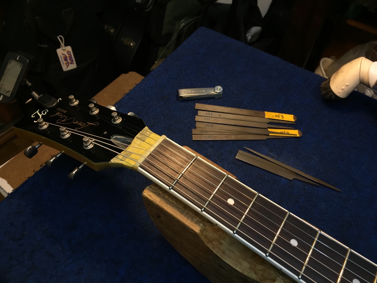 調整をして完成【Tokai LSS158 SEB(20250824お預かり)のチューンナップ-24】 投稿日時: 2026年4月10日 投稿者: admin 弦溝の深さを調整します。 外していたパーツを戻していきましょう。 ナットを仕上げて追いグリスしておきます。 弦高とオクターブチューニングをしました。 せっかくピックアップの高さ調整ができるのに音量が合わないのが気になってきてしまいました。 リア側のクッションを交換してみました。 これで音量が合わせられます。 これで作業が完了しました。 ラップアラウンドブリッジが入荷しなくて長く止まっていましたが無事に完成しました。 Tweet