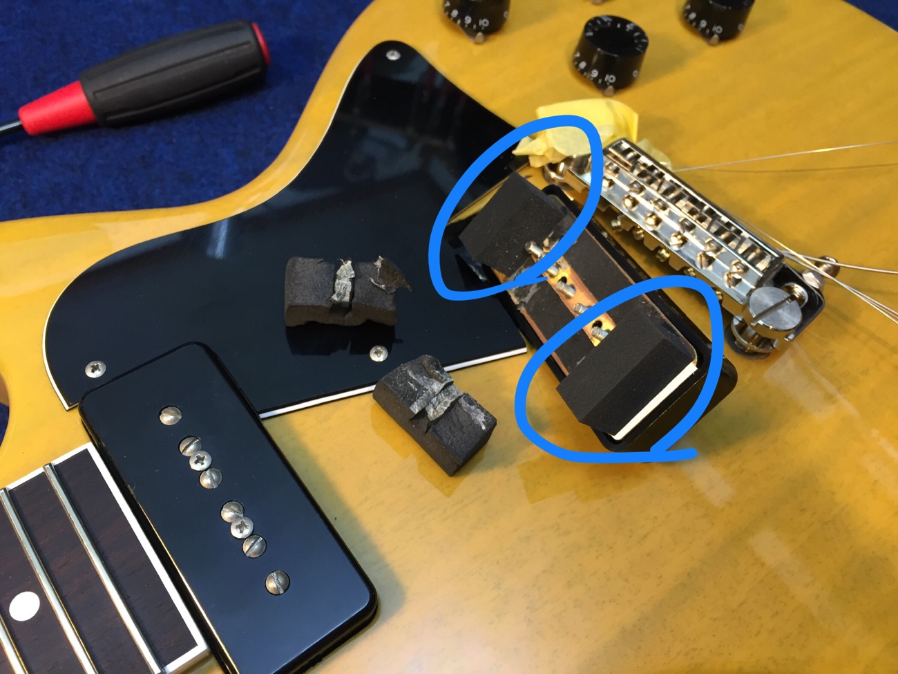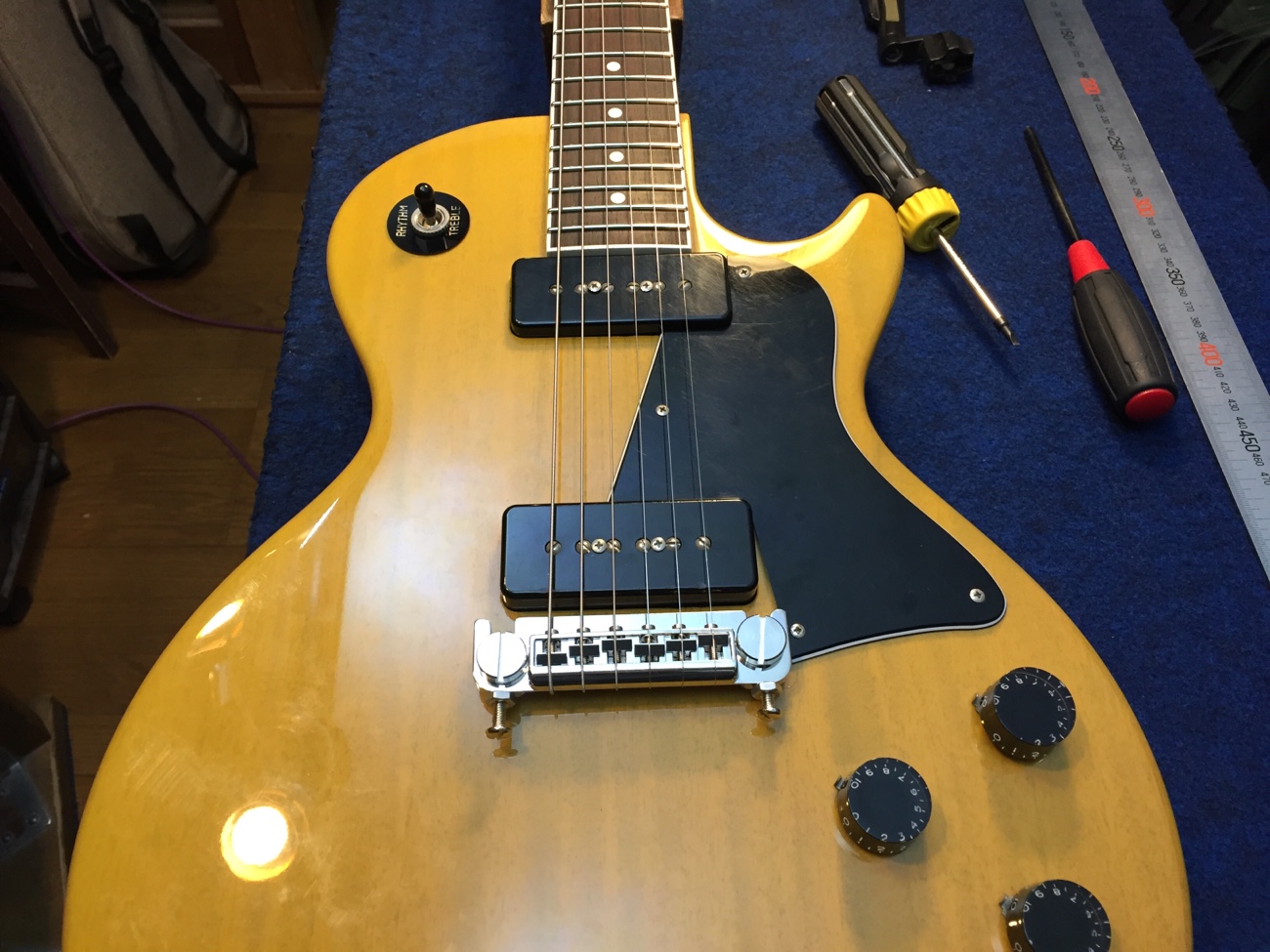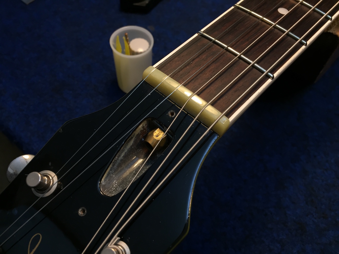 調整をして完成【Tokai LSS158 SEB(20250824お預かり)のチューンナップ-24】 投稿日時: 2026年4月10日 投稿者: admin 弦溝の深さを調整します。 外していたパーツを戻していきましょう。 ナットを仕上げて追いグリスしておきます。 弦高とオクターブチューニングをしました。 せっかくピックアップの高さ調整ができるのに音量が合わないのが気になってきてしまいました。 リア側のクッションを交換してみました。 これで音量が合わせられます。 これで作業が完了しました。 ラップアラウンドブリッジが入荷しなくて長く止まっていましたが無事に完成しました。 Tweet