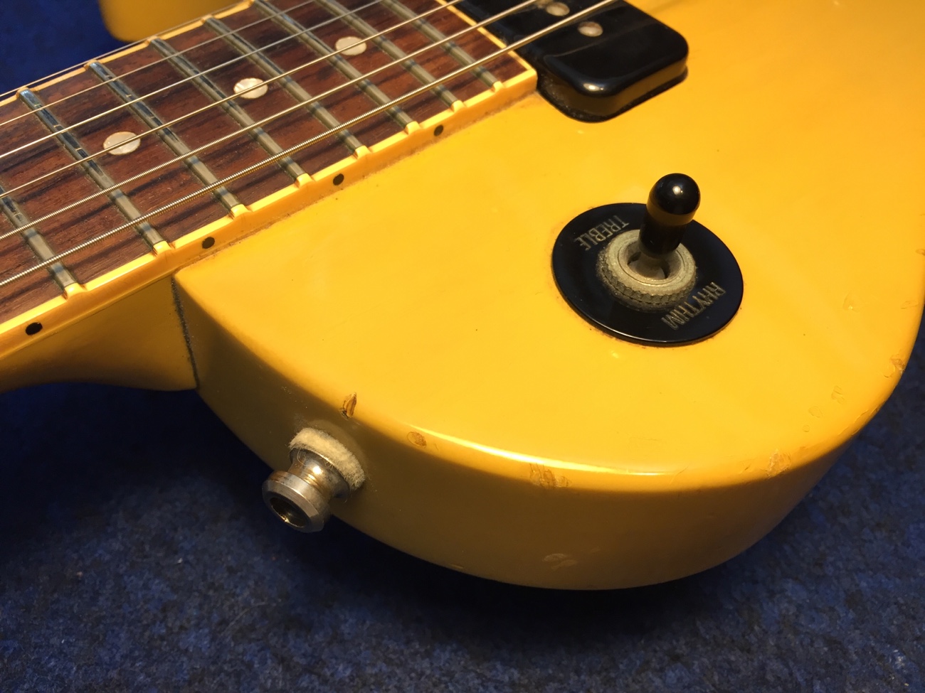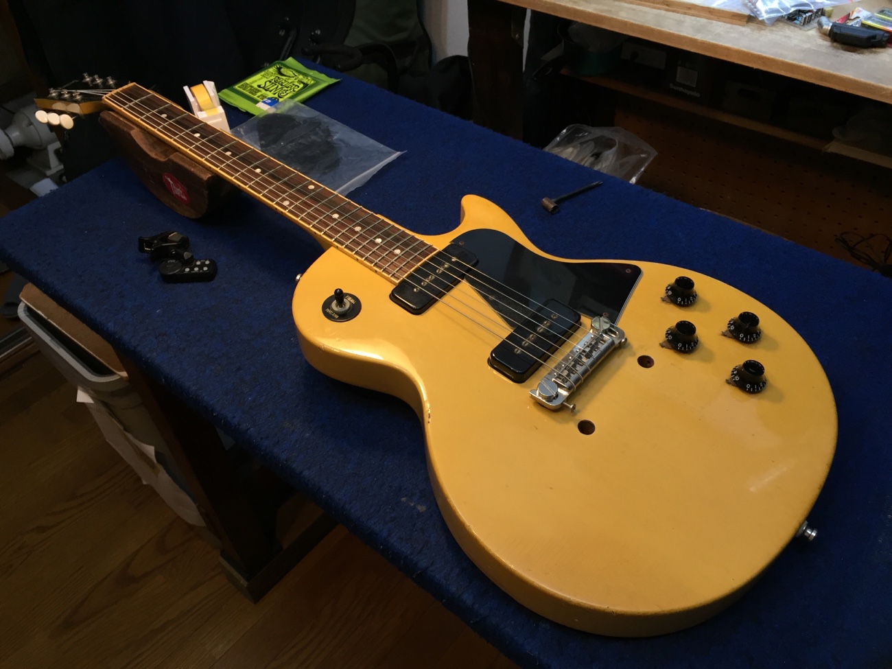 レスポールスペシャルをお預かりしました。 すでにいろいろと部品を交換されています。 交換痕が残ったままになっているのもお好みのようなので、アンカーの穴などは、今回はあけたままにします。