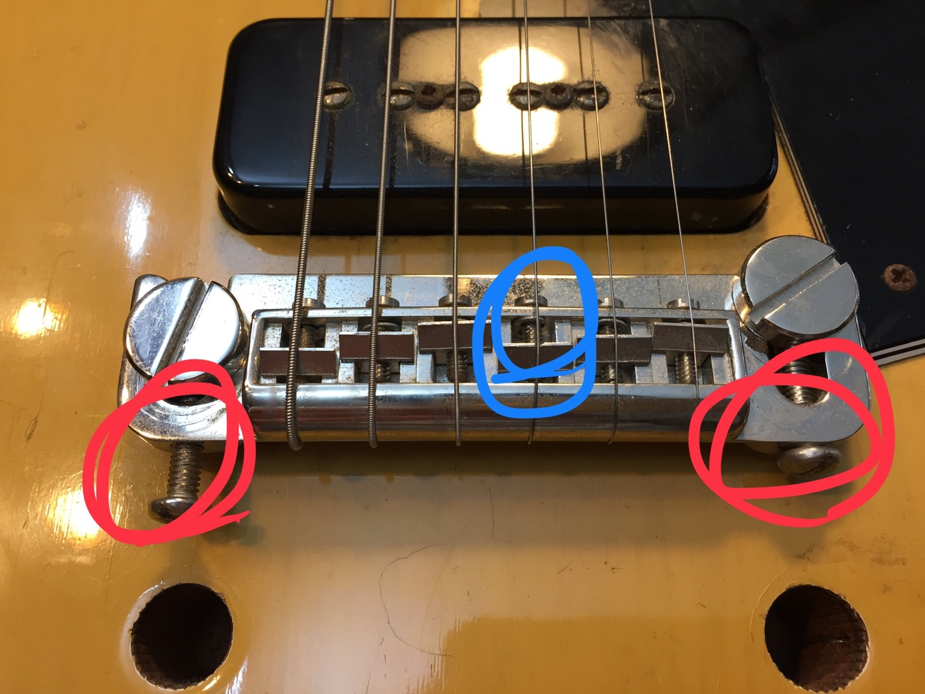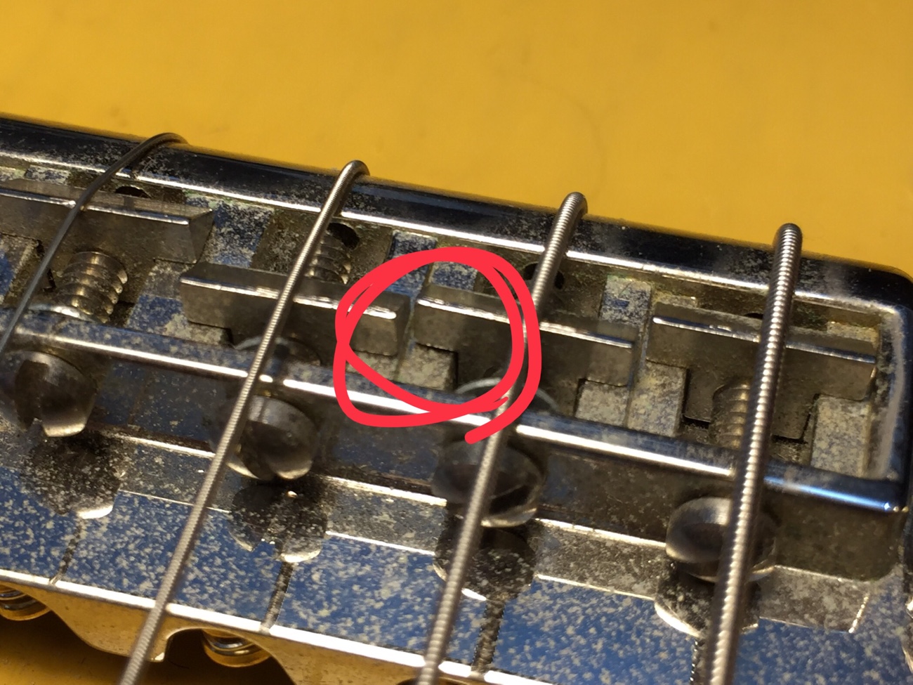 もともとがバーブリッジでないので、サドルの中央に弦が来ています。 5弦のサドルがシーソーのように動いてしまって異音を放っています。 ブリッジを加工してサドルを押さえ込みたいですね。