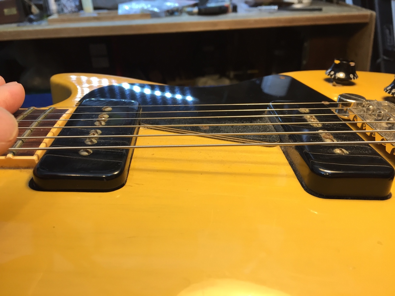 ピックアップの高さ調整ができるタイプなので、ネック側を下げてブリッジ側をあげるようなセッティングにしたいところです。