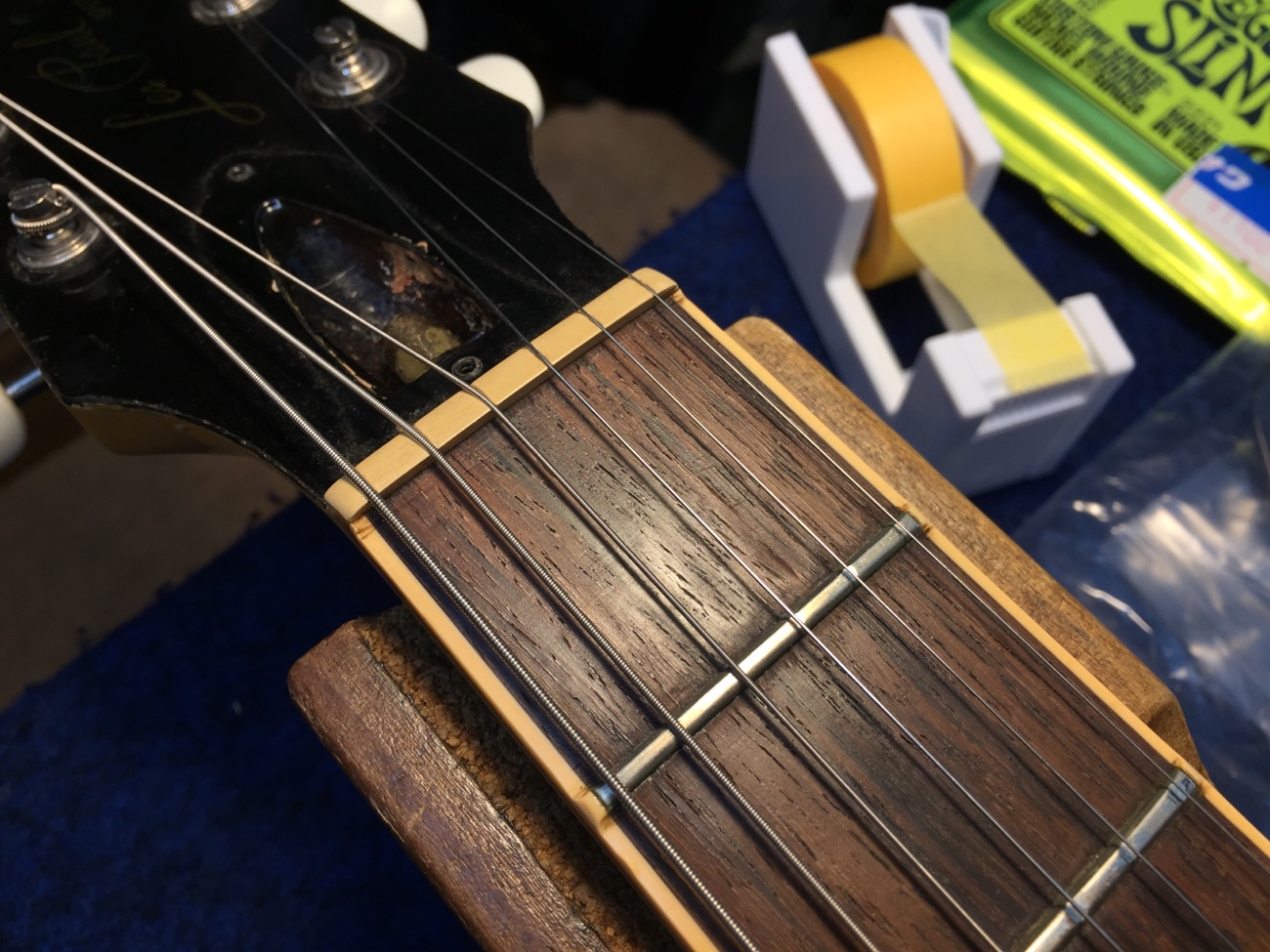 ジェスカーのステンレスフレット#55090に交換します。 ナットはうちでオイル漬けした無漂白ナットに交換します。
