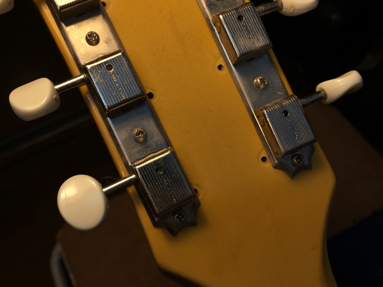 もともとはロトマティックがついていたところに3連のクルーソンが付けられています。 ペグ穴の並びに合っていないことが原因で動きが渋くなっていますが、今回はそのままにしておいて、後々考えるということになりました。