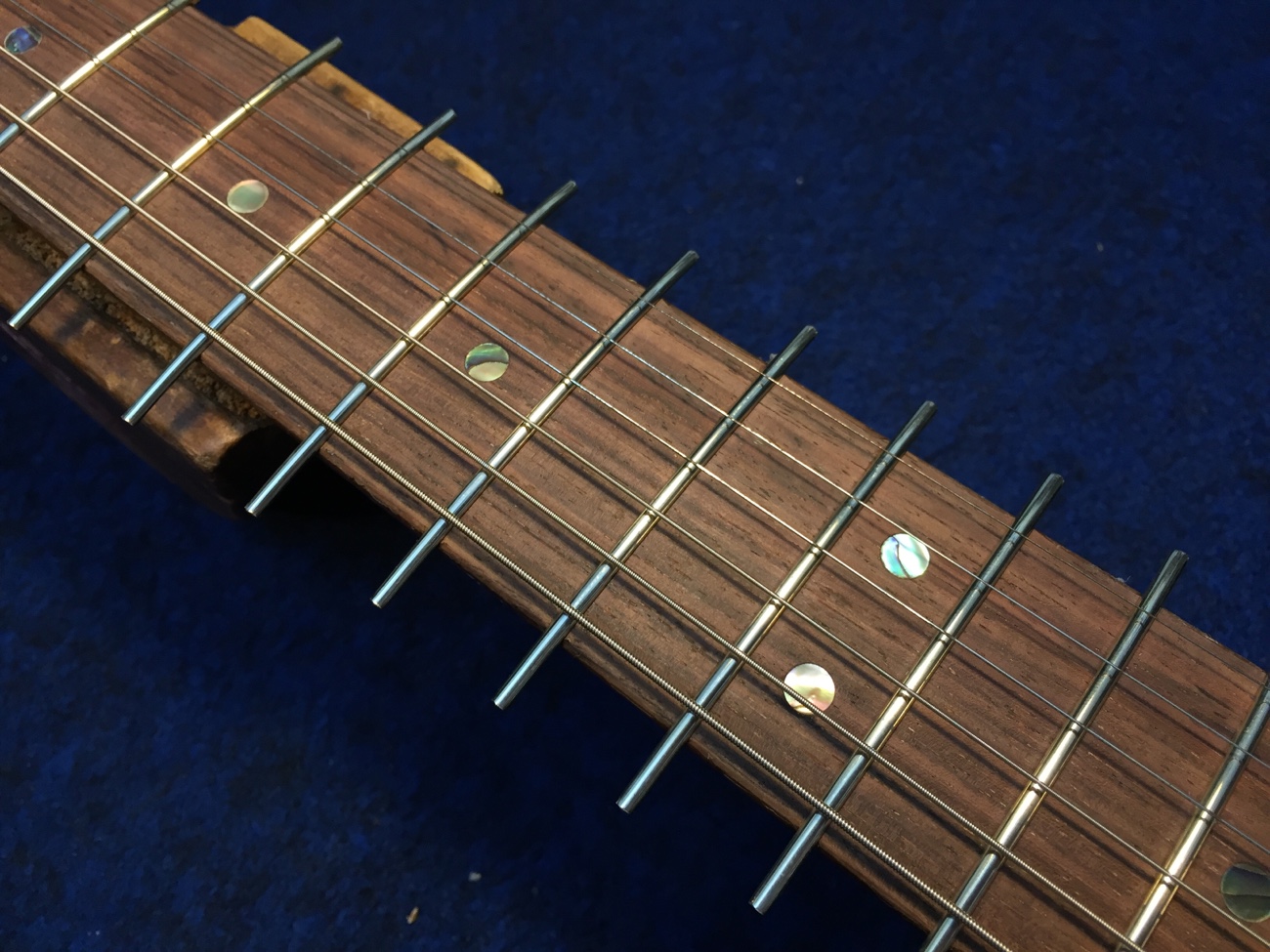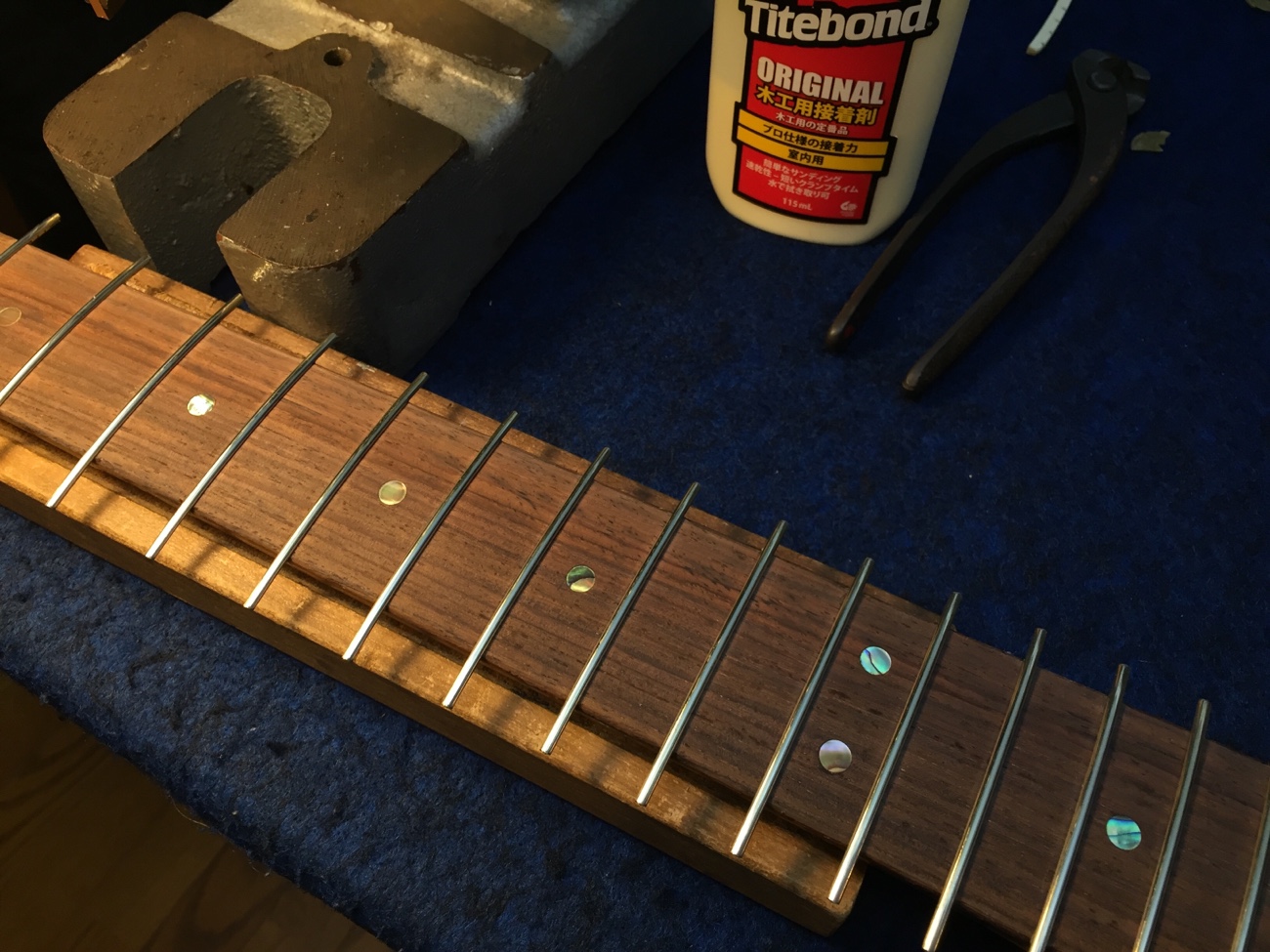 フレットを打った 投稿日時: 2026年4月30日 投稿者: admin 指板研磨を仕上げて、フレット溝の深さと幅を調整したのでフレットを打っていきます。 ロッドナットをめいっぱい締めたときに「ほぼ真っ直ぐだけれどハイポジションのみ順反りが残る」という状態でしたが、溝を調整して打った結果、「少しロッドを締めたら全体的にほぼ真っ直ぐ」にできたと思います。 フレットのすり合わせで頂点をさらにバシッとそろえたいところです。 Tweet