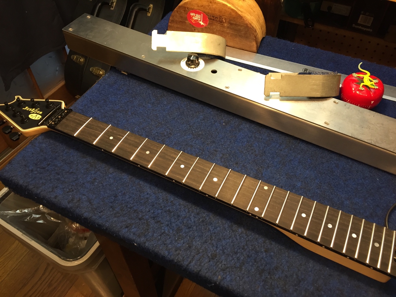 弦を張っておく【EVHのフレット交換-10】 投稿日時: 2026年3月23日 投稿者: admin フレットを打ったことで反り具合が微妙に動いたのでヒーターをあててみました。 接着剤の種類のせいかヒーターが効きにくいネックで、かなりの部分が戻ってしまいますが、少しは効いたことでトラスロッドに60°ほどの余裕ができました。 ダミーボディを使って弦の張力をかけています。 もうしばらく様子をみて問題なさそうならすり合わせをして完成させましょう。 Tweet