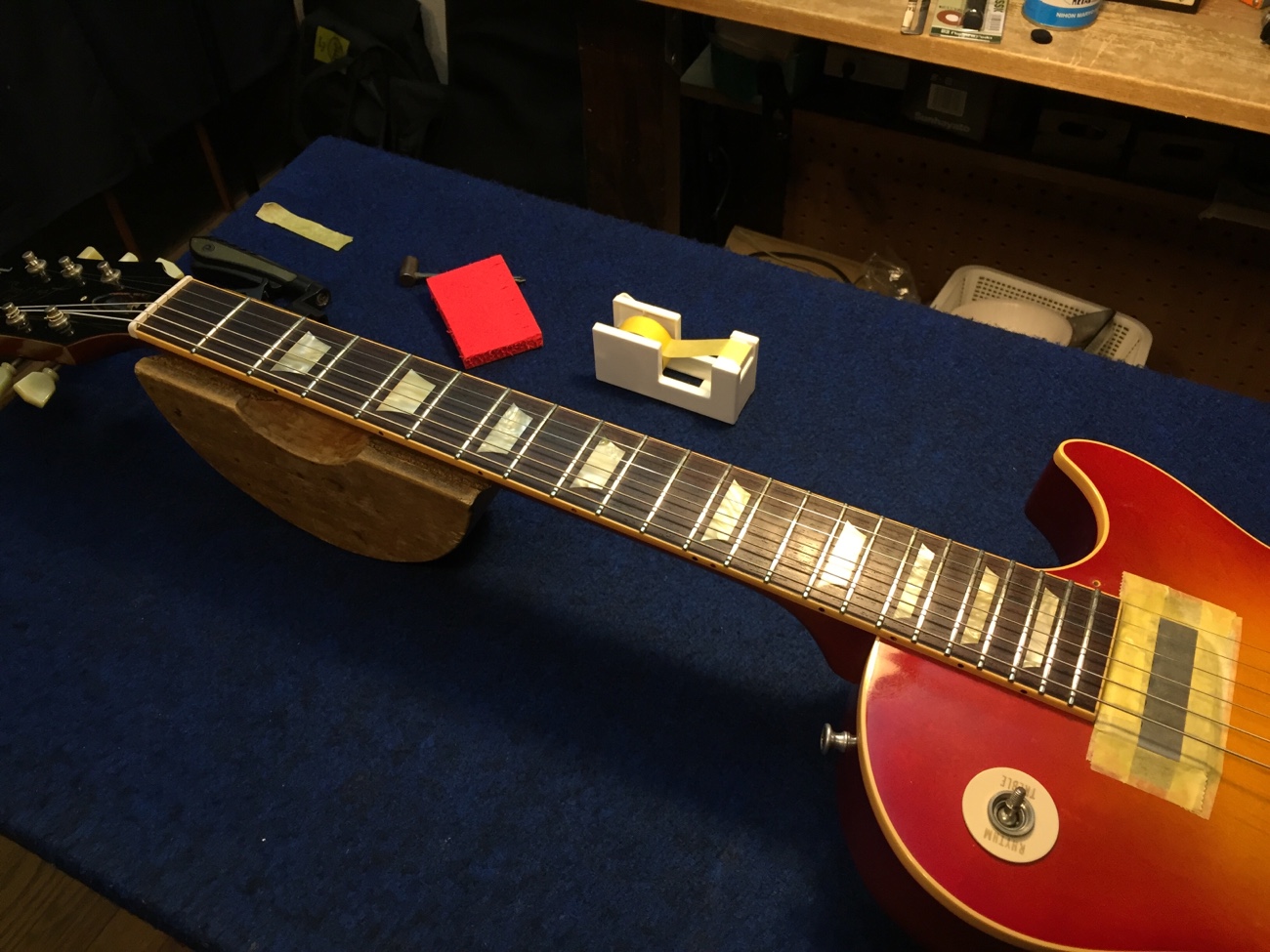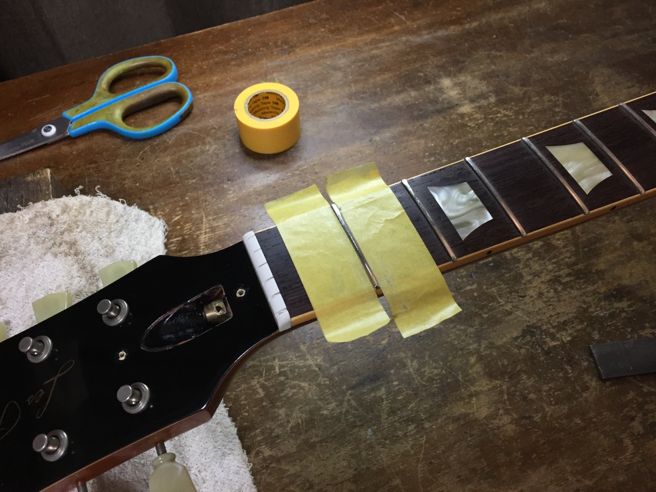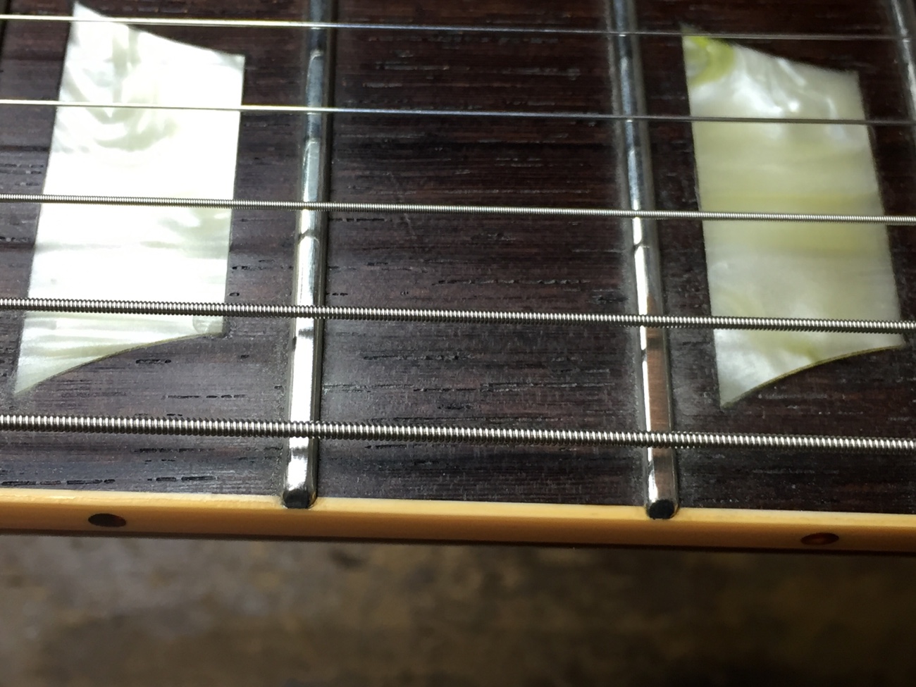 フレットの高さをなるべく一緒にしようとすると、中央に弦との間に隙間ができます。 そういう指板の状態なのでしょう。 ロッドを少し締めたりしつつフレットの頂点を整えていきます。